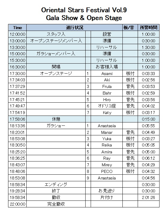この度はOriental Stars Festival Vol.9 -Anastasia Biserova- にご出演頂き誠にありがとうございます。こちらのページにてGala Showの進行についてお伝えしていきます。決まり次第随時掲載していきますので各自お読み頂きスムーズな進行にご協力頂きますようお願い申し上げます。